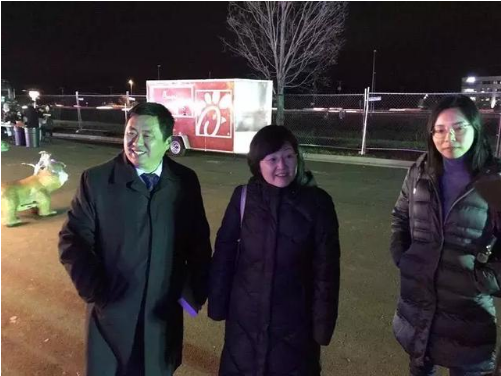 自貢燈貿(mào)集團(tuán)執(zhí)行總裁陶建軍向駐美公使銜參贊李鴻介紹華盛頓燈展情況。