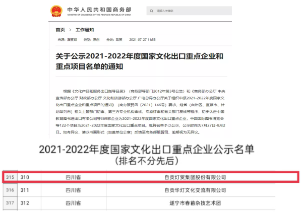 近日,商務(wù)部、中宣部、財政部、文化和旅游部、國家廣電總局五部委聯(lián)合公示《2021—2022年度國家文化出口重點(diǎn)企業(yè)和重點(diǎn)項(xiàng)目名單》,自貢燈貿(mào)集團(tuán)股份有限公司再次入錄“2021-2022年度國家文化出口重點(diǎn)企業(yè)”公示名目。這是自貢燈貿(mào)集團(tuán)股份有限公司自2007年以來,連續(xù)第八次榮獲此殊榮,也是全國彩燈行業(yè)唯一連續(xù)八屆十六年獲此殊榮的服貿(mào)類企業(yè)。